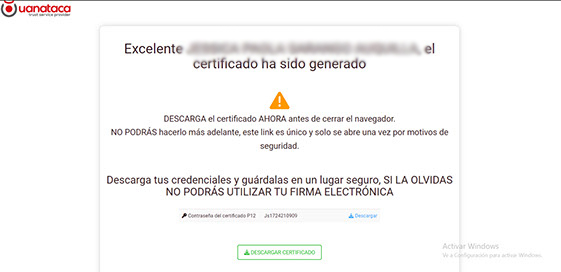 * Recuerda que una vez que haces click en el botón azúl, no debes cerrar la ventana de tu navegador hasta terminar todo el proceso de activación. Descarga la firma en tu PC personal, guárdala en un lugar seguro y si necesitas lo puedes reenviar a tu dispositivo móvil